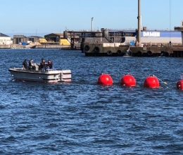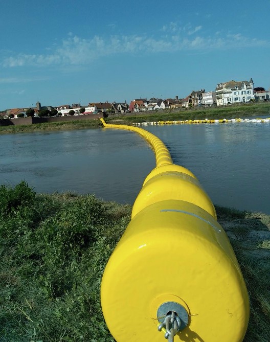 Ce barrage traversant la Canche au niveau d'Etaples est composé de 50 Flotteurs Ø 1000 mm x 1500 mm  + 15 Flotteurs Ø 1000 x 1000 mm ainsi que tous les accessoires de liaison anti-cisaillement qui relient ces flotteurs