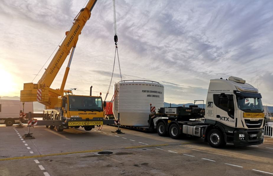 Déchargement du Coffre d'Amarrage 200 Tonnes installé pour accueillir les plus grands Navires de Croisières au Terminal dédié à Ajaccio. Il rejoindra son "petit frère" livré et installé en Juin 2016 qui donne toute satisfaction depuis.