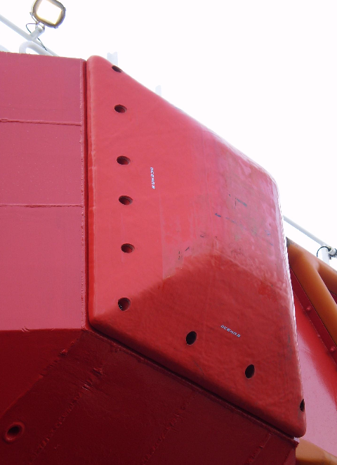 - Boulonnage dans le cas où la reconstruction d'un profil de maintien ne peut être envisagée ou que le collage s'avère délicat voire impossible. Les défenses comportent dans ce cas un insert métallique noyé qui sera boulonné par l'intérieur de la Vedette, ou dérivé par l'extérieur si l'accès n'est pas permis de l'intérieur.